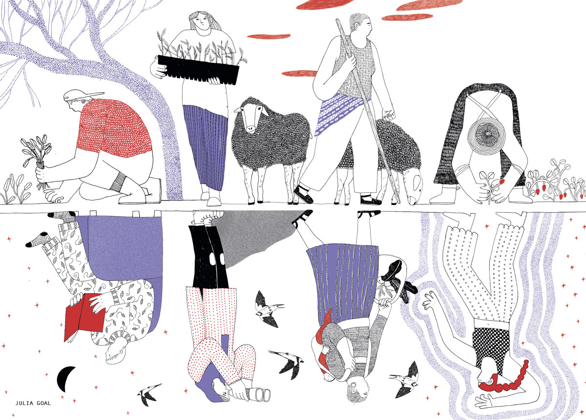 Julia Gómez Alonso (1991) nació en Guadalajara y sus horizontes, como los de la Alcarria, son muy variados. Estudió Magisterio de Educación Especial y se formó en Atención Temprana y Psicomotricidad. Al vivir lejos de casa, el dibujo se convirtió en su forma de contar cómo eran sus días y, al volver, comenzó su camino en la ilustración y el grabado en la Escuela de Arte Número 10 de Madrid. Desde entonces, la ilustración le ha permitido colaborar con bandas musicales, festivales de danza tradicional, como Folkarria o Bailando entre montañas, y proyectos ligados a la sensibilización en materia ecosocial, como el Rincón Lento. A finales de 2025, puso en marcha en Guadalajara, junto con un grupo de amigas, El Semillero, un espacio de trabajo compartido y aula de arte, donde ya se gestan iniciativas tan bellas como La Placentera, una pequeña biblioteca colaborativa. Ilustrar es hoy su forma de encontrarse con el mundo.